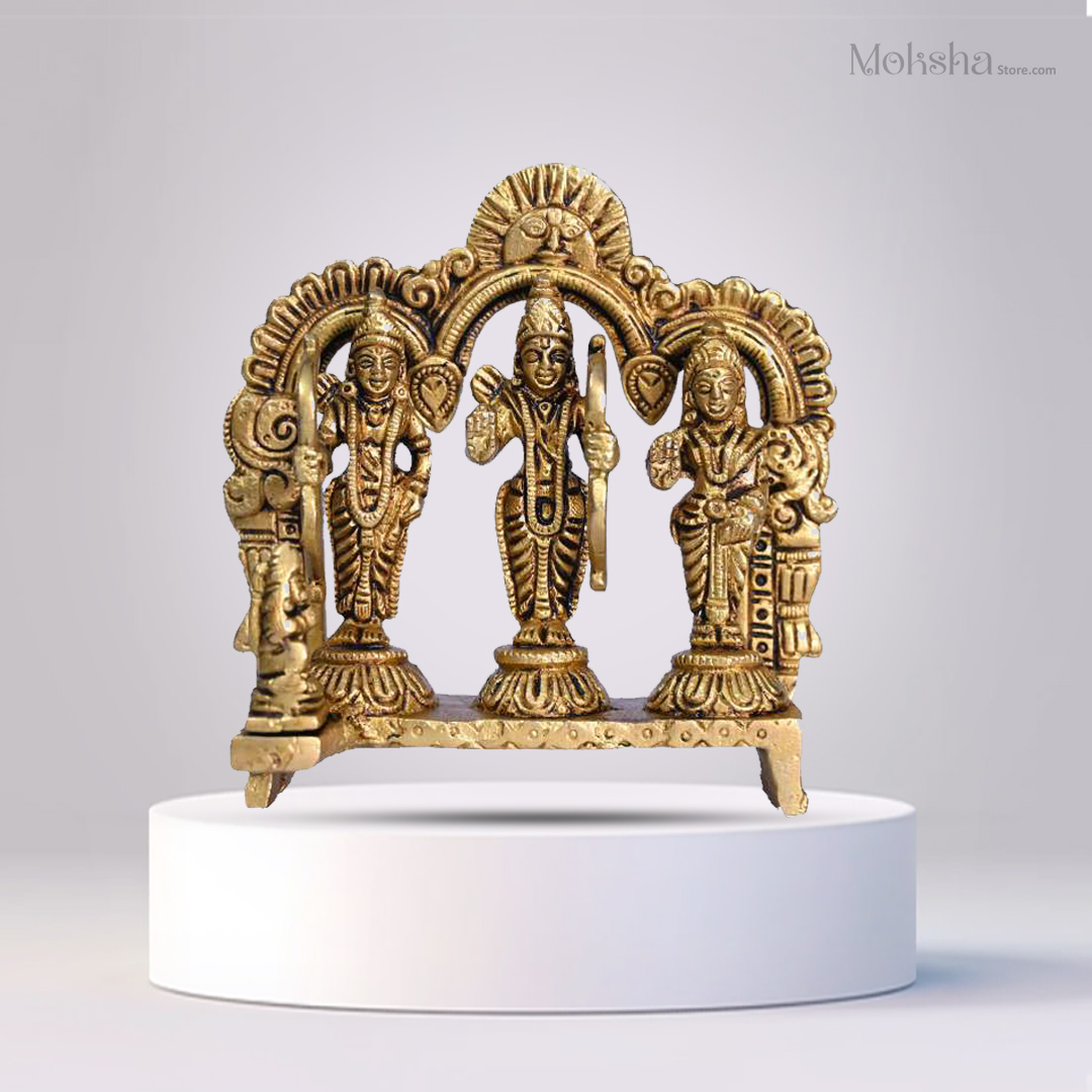 Celebrate the divine virtues of love, loyalty, and righteousness with this finely crafted brass Ram Darbar idol from Moksha Store. Measuring 5 inches in height, 4 inches in width, and weighing 800 grams, this beautifully detailed piece features Lord Ram, Sita, Lakshman, and Hanuman in a sacred formation. Ideal for small pooja spaces or as a heartfelt gift, this idol brings warmth, balance, and blessings to any setting.